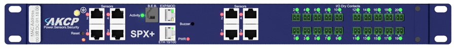 De SPX+ is een veelzijdige IP-gebaseerde sensorbewakingsunit. Sluit tot 16 van AKCP's intelligente sensoren, 20x potentiaalvrije contacten, 0-5 VDC of 4-20mAmp ingangen aan, stuur relaisuitgangen aan en bewaak apparaten van derden.
